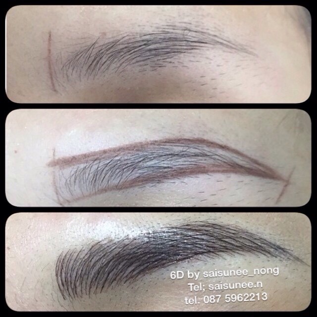 วิธีการทำคิ้ว 6 มิติ ใช้วิธีการสักให้มีลายเส้นเหมือนเส้นขนคิ้วจริง เส้นขนคิ้วจะดูพริ้วสวยดูเป็นธรรมชาติกว่าการสักด้วยเครื่อง ช่างต้องมีความใจเย็น วาดลายเส้นละเอียดสวยงามจึงจะได้ลายเส้นที่สวยงามดูเป็นธรรมชาติเหมือนขนคิ้วจริง