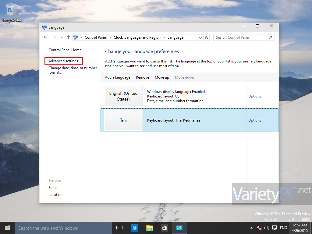 แล้วคลิกหัวข้อ Advanced settings เพื่อกำหนดค่าให้ปุ่มสลับภาษา Grave Accent ทำงานได้