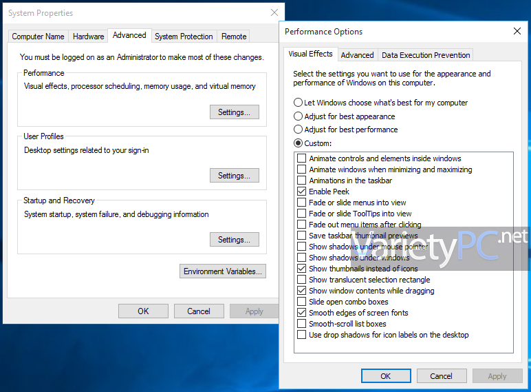 – คลิกแท็บ Advanced -> หัวข้อ Performance คลิกปุ่ม Settings